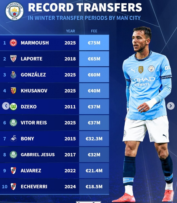 曼城冬窗引援榜:馬爾穆什7500萬(wàn)歐居首,岡薩雷斯6000萬(wàn)歐第3