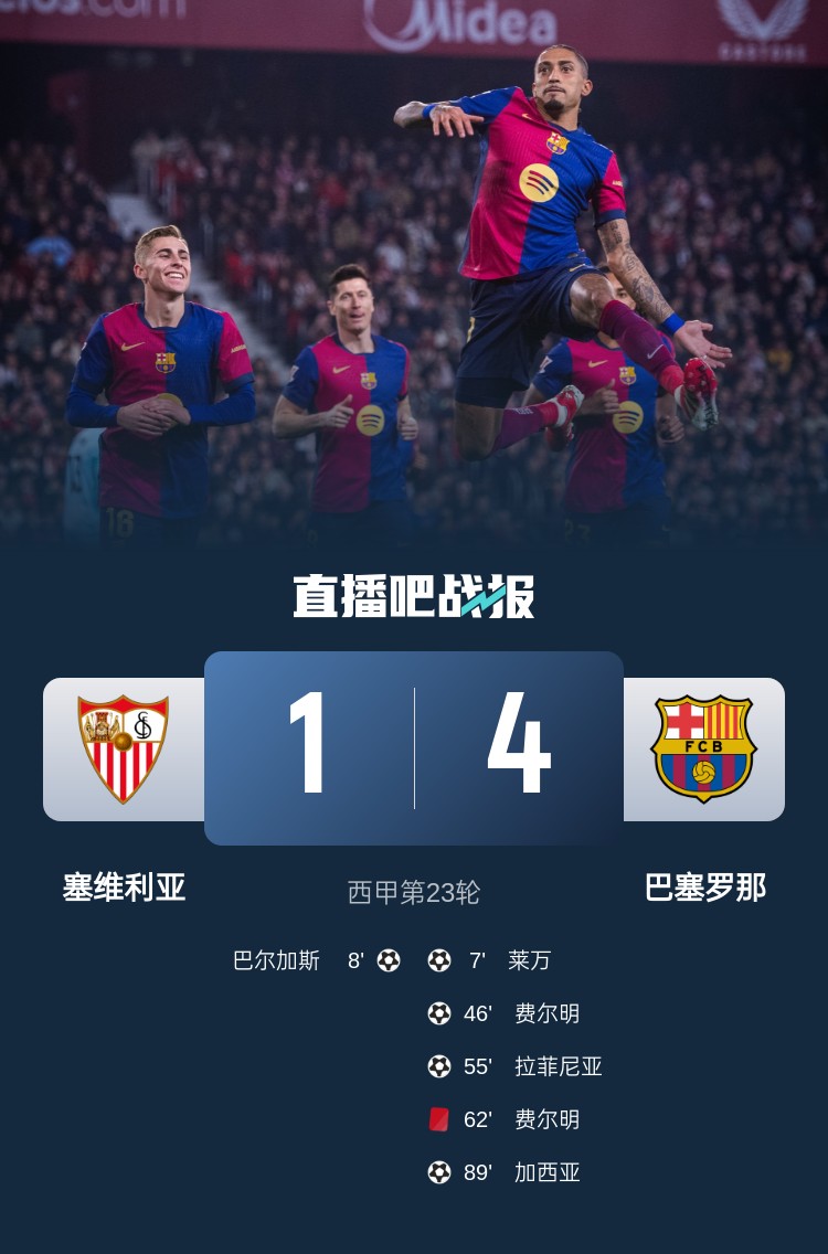 西甲第23輪,巴薩4-1塞維,距離榜首僅差2分。上半場(chǎng),萊萬墊射破門,巴爾加斯1分鐘后迅速扳平,阿勞霍被鏟傷退;下半場(chǎng),費(fèi)爾明頭球,拉菲尼亞再下一城,費(fèi)爾明紅牌,補(bǔ)時(shí)前埃里克-加西亞再進(jìn)一球。