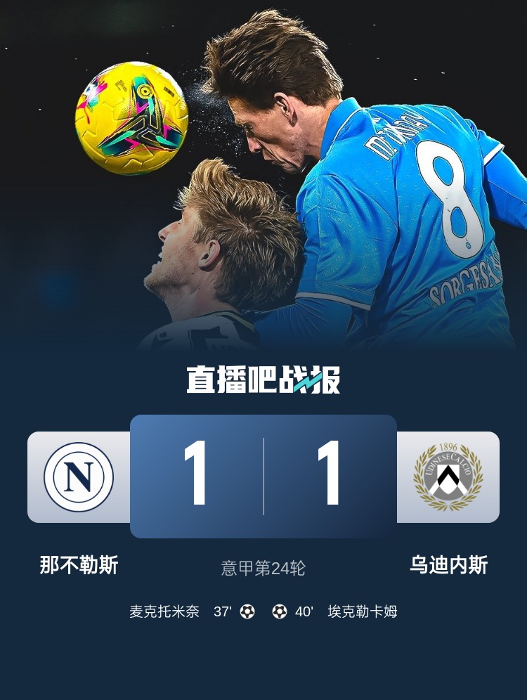 意甲第24輪,那不勒斯1-1戰(zhàn)平烏迪內(nèi)斯。上半場(chǎng),麥克托米奈率先打破僵局;埃克勒卡姆扳平比分。下半場(chǎng),雙方均無建樹。